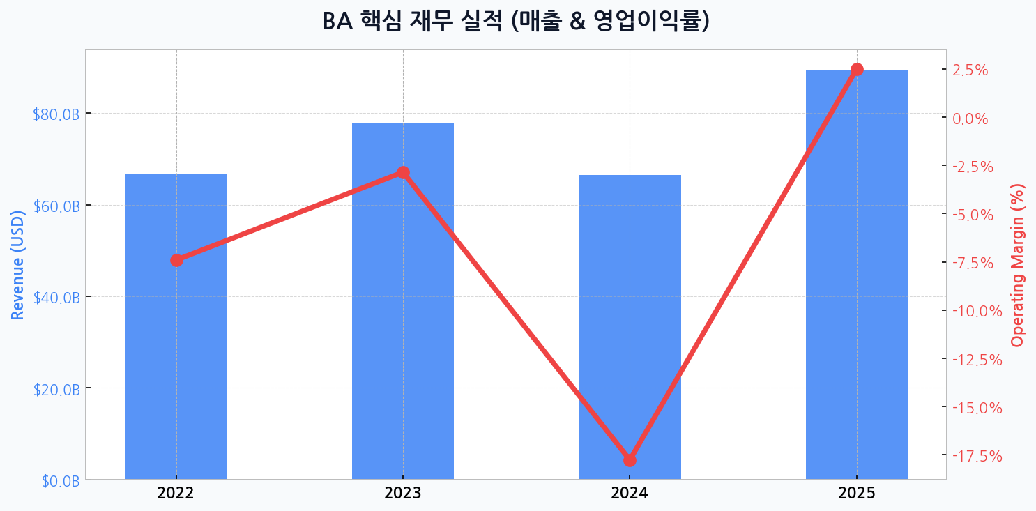 펀더멘털 데이터는 현재 보잉이 겪는 고통의 깊이를 명확히 보여줍니다. 2023년 매출이 778억 달러로 소폭 회복세를 보였으나, 2024년에는 다시 665억 달러로 주저앉고 영업이익률은 -17.8%라는 충격적인 수치를 기록할 전망입니다. 이는 생산 차질에 따른 비용 증가와 일회성 손실이 반영된 결과로, 시장은 이를 본격적인 회복에 앞선 바닥 다지기 과정으로 해석하고 있습니다.