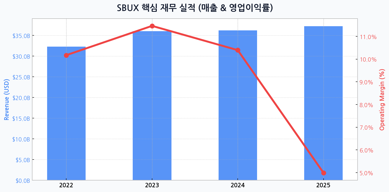 시장이 스타벅스에 부여했던 프리미엄은 강력한 브랜드 파워와 안정적인 이익 창출 능력이었습니다. 그러나 이 근간이 흔들리고 있습니다. 매출은 2025년 372억 달러로 성장할 전망이지만, 같은 해 영업이익률은 2023년 11.5%에서 5.0%로 추락할 것으로 예측됩니다. 이는 외형 성장에도 불구하고 이익의 질이 급격히 악화되고 있음을 의미하는 가장 위험한 신호입니다. 확장 투자 비용, 인건비 상승, 원재료 가격 압박이 임계점을 넘어서고 있다는 분석입니다.