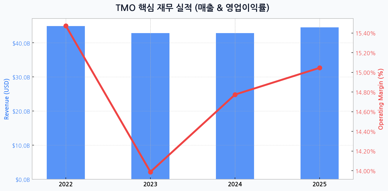 코로나19 팬데믹 기간 동안 진단키트 및 관련 장비 수요 폭증으로 엄청난 성장을 구가했던 써모피셔는 엔데믹 전환과 함께 자연스러운 실적 조정을 겪고 있습니다. 2022년 449억 달러에 달했던 매출은 2023년 429억 달러로 소폭 감소했으며, 영업이익률 역시 15.5%에서 14.0%로 하락하며 단기적인 수익성 둔화를 보였습니다. 하지만 이는 역성장이 아닌 '정상화' 과정으로 해석해야 합니다.