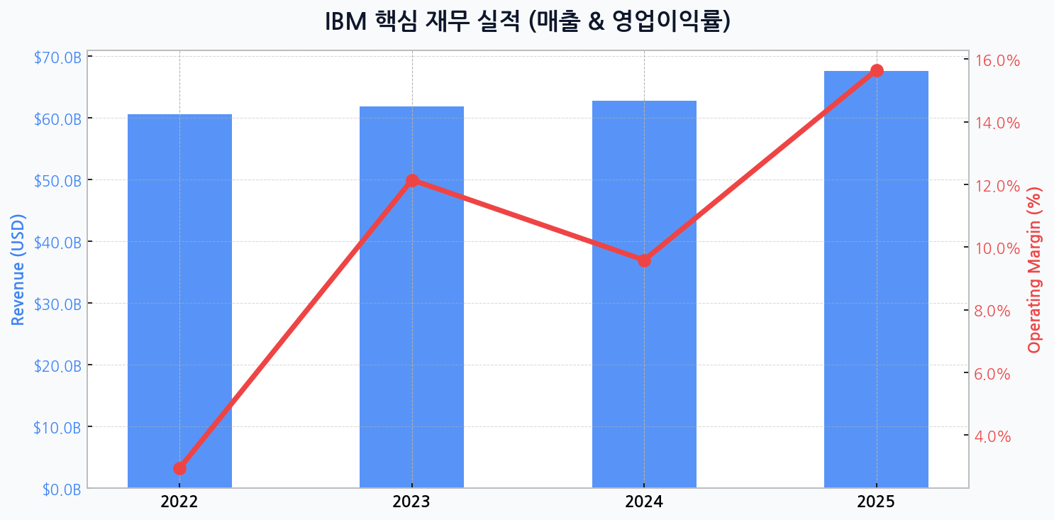 IBM의 재무 성과는 극적인 V자 반등을 보여줍니다. 2022년 2.9%에 불과했던 영업이익률은 2023년 12.1%로 급등했으며, 2024년 9.6%로 잠시 숨을 고른 뒤 2025년에는 15.7%라는 경이로운 수치를 목표로 하고 있습니다. 2024년의 일시적 마진 하락은 저수익 사업부 매각과 AI 및 클라우드 인프라에 대한 전략적 투자 집행 과정에서 발생한 것으로, 더 큰 도약을 위한 건강한 조정으로 평가됩니다. 매출 역시 2022년 605억 달러에서 2025년 675억 달러까지 꾸준한 우상향이 예상됩니다.
