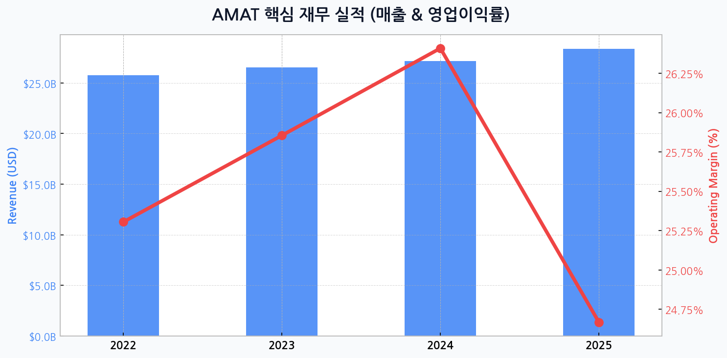 어플라이드 머티어리얼즈는 글로벌 파운드리 3사(TSMC, 삼성전자, 인텔)의 천문학적인 설비 투자 경쟁의 가장 확실한 수혜자로 부상하고 있습니다. 시스템이 제공한 데이터에 따르면, 회사의 매출은 2022년 258억 달러에서 2025년 284억 달러까지 꾸준한 외형 성장을 지속할 전망입니다. 이는 반도체 산업의 구조적 성장에 따른 장비 수요 증가가 AMAT의 핵심 성장 동력으로 작용하고 있음을 명확히 보여줍니다. 다만, 같은 기간 영업이익률이 2024년 26.4%로 정점을 찍은 후 2025년 24.7%로 소폭 조정될 것으로 예상되는 점은 단순한 외형 확대를 넘어선 질적 성장에 대한 고민이 필요한 시점임을 시사합니다.