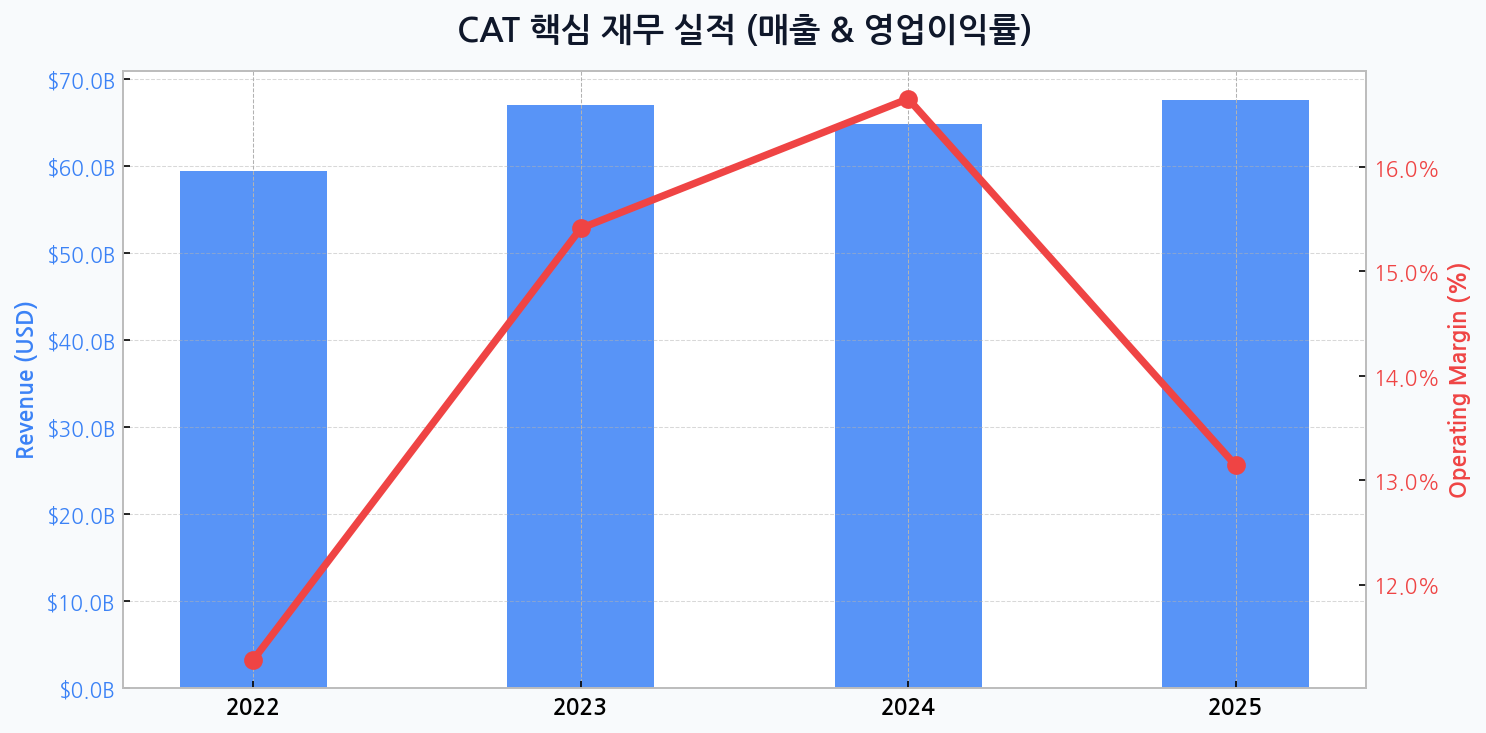[그래프] 캐터필러의 매출액(파란색 막대)은 2023년에 정점을 찍은 후 2024년 소폭 조정을 거쳐 2025년 반등하는 U자형 패턴을 보일 것으로 예상됩니다. 반면 영업이익률(빨간색 선)은 2024년 최고치를 기록한 후 하락할 것으로 전망되어, 외형 성장과 수익성 간의 동조화가 향후 과제로 남았습니다.