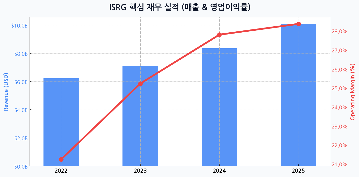 인사이트: 전체 매출에서 소모품과 서비스가 차지하는 비중이 과반을 넘어서면서, 인튜이티브 서지컬의 실적은 단순 장비 판매 사이클을 넘어 안정적인 우상향 곡선을 그리고 있습니다. 이는 경기 변동에 대한 방어력을 높여주는 핵심 요소입니다.