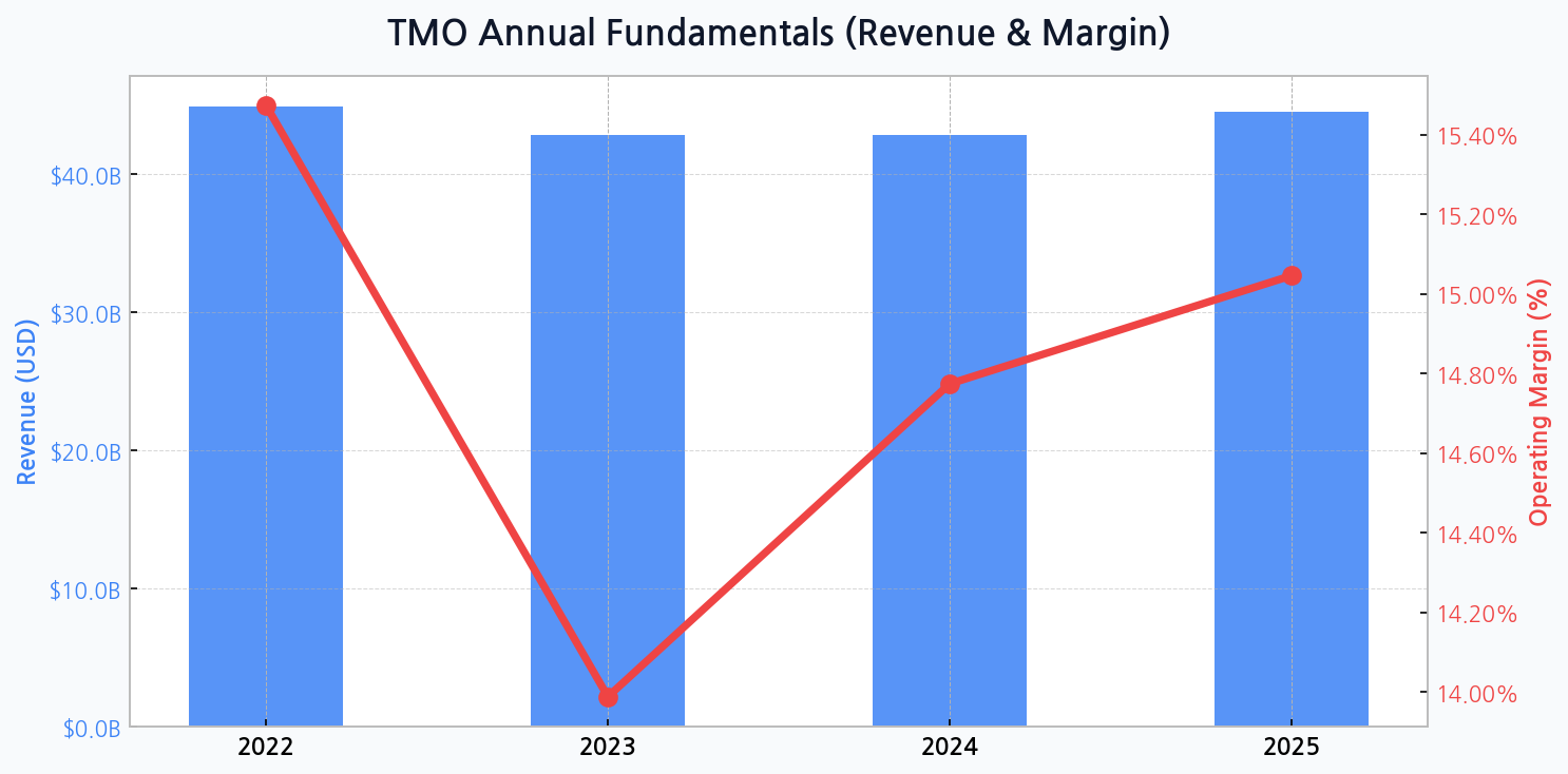 [Chart] Thermo Fisher's annual revenue shows a post-2022 normalization, while operating margin is projected to recover steadily after a dip in 2023.