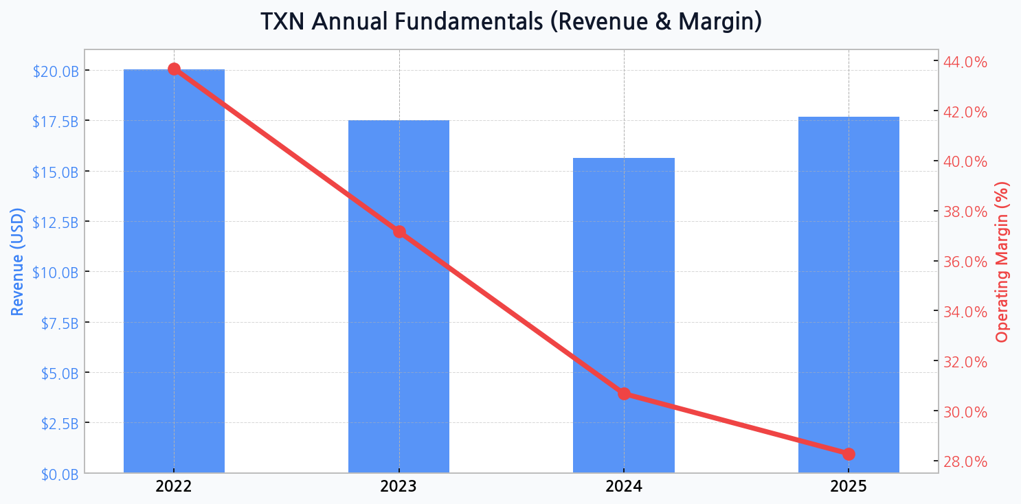 Texas Instruments' long-standing dominance in the analog semiconductor space is undeniable, yet it's not immune to market cycles. The firm's revenue trajectory, falling from a high of $20.0B in 2022 to a projected $15.6B in 2024 before a slight recovery to $17.7B in 2025, illustrates a significant industry-wide correction. This downturn tests the resilience of its vaunted business model.