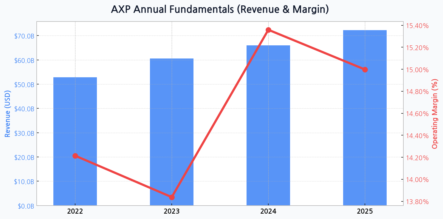 [Chart] American Express's projected revenue growth continues its steady climb, while operating margins are expected to stabilize around the 15% mark after a volatile period.