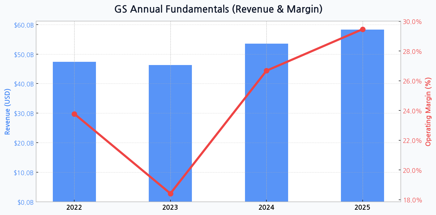 DIFF Insight: The table highlights GS's specialized, high-beta model compared to its peers. While this leads to greater volatility, it also provides superior upside during strong capital market cycles. JPMorgan's diversified model provides a resilient floor, but GS's model offers a higher ceiling, making it a more aggressive play on economic recovery.