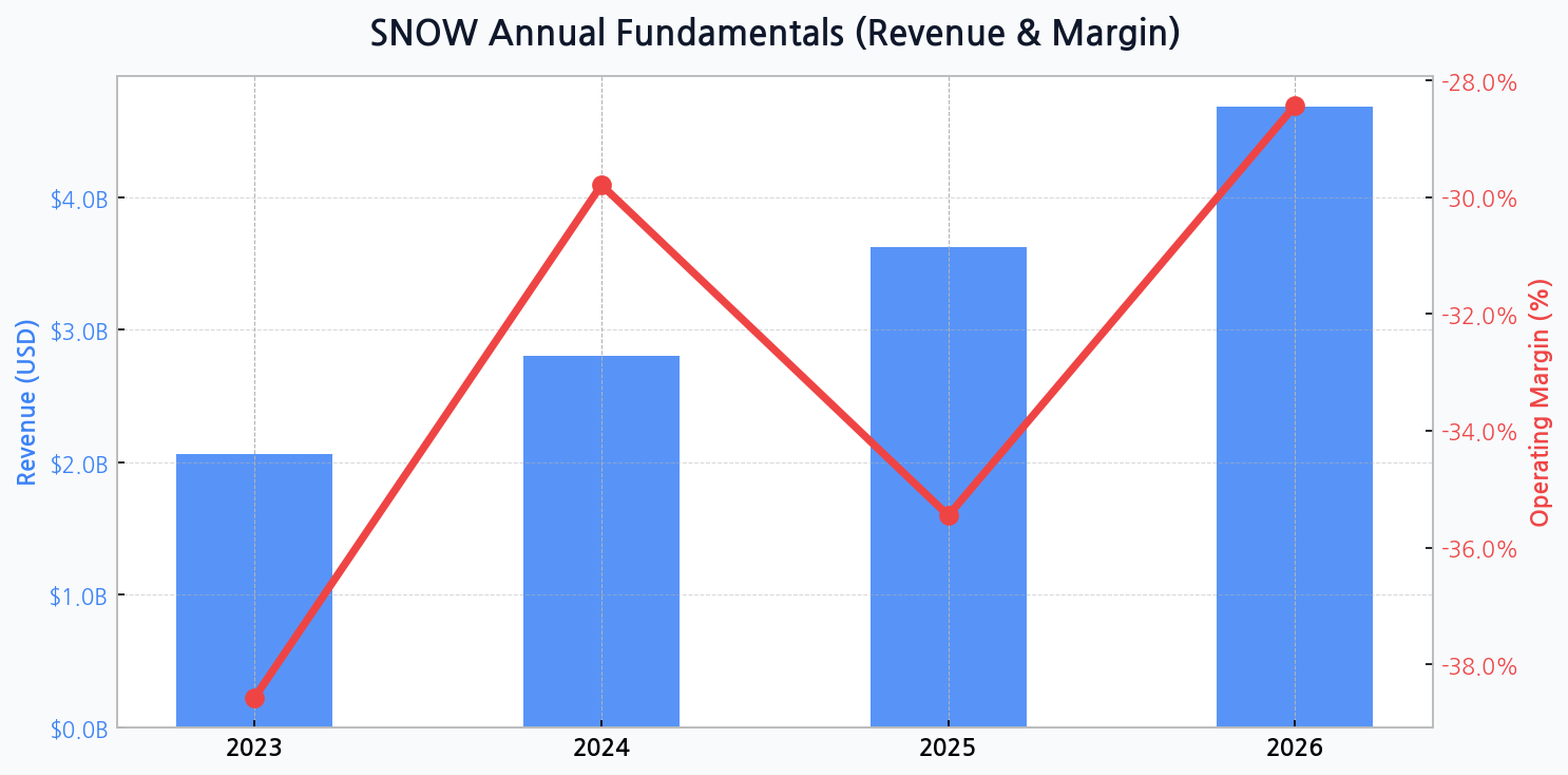 [Chart] Snowflake's Annual Revenue shows strong upward momentum, while its Operating Margin remains volatile and consistently in negative territory, highlighting the ongoing challenge of balancing growth with profitability.