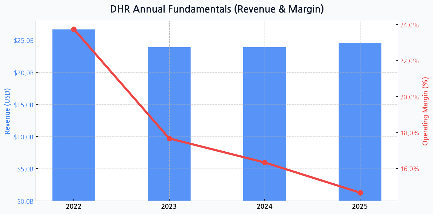 Danaher's operational prowess, long celebrated through its Danaher Business System (DBS), is facing a stark reality check. The company's revenue stream is stabilizing, moving from $26.6B in 2022 to a projected $24.6B by 2025, but this masks a more concerning trend. The operating margin is on a sharp descent, contracting from a healthy 23.8% in 2022 to a forecasted 14.7% in 2025, signaling significant cost pressures and a challenging post-pandemic normalization.