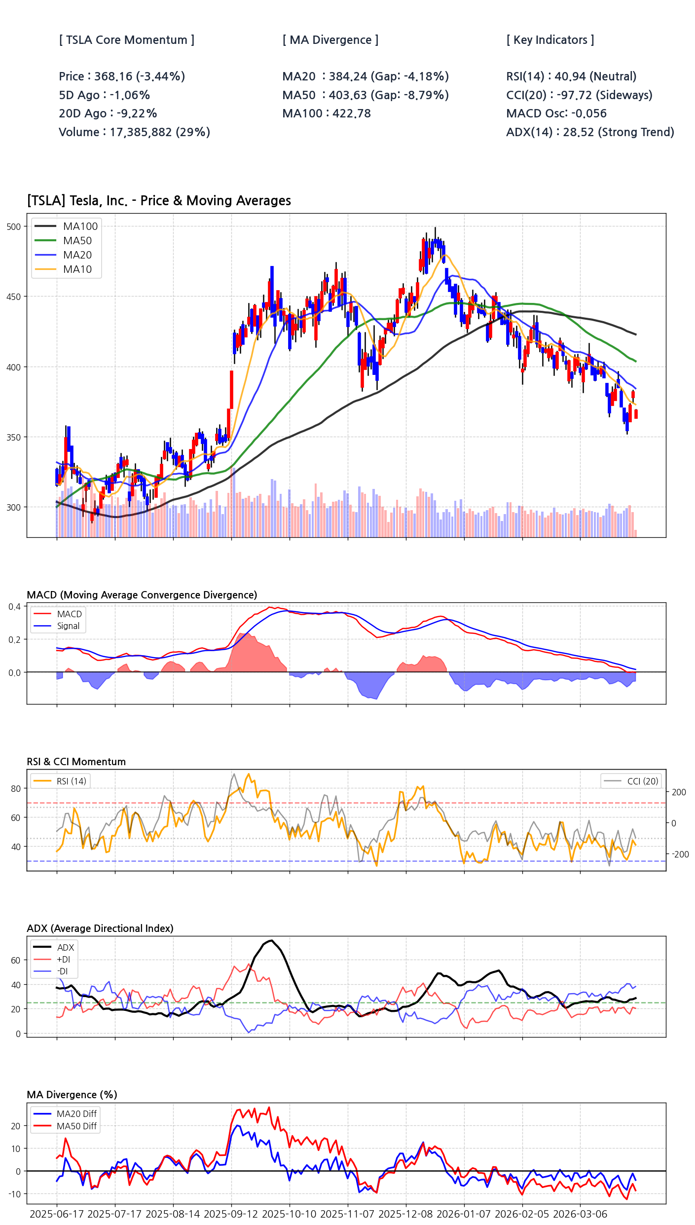 The current chart structure for TSLA is a textbook example of bearish alignment. The faster moving averages (MA10, MA20) are trading decisively below the slower ones (MA50, MA100), creating a classic 'death cross' formation that often precedes further declines. The MA Divergence chart confirms this, with the MA20 and MA50 difference plunging into negative territory. This isn't a minor dip; it's a structural shift in trend that suggests overhead supply will cap any rally attempts near the $385-$400 resistance zone.